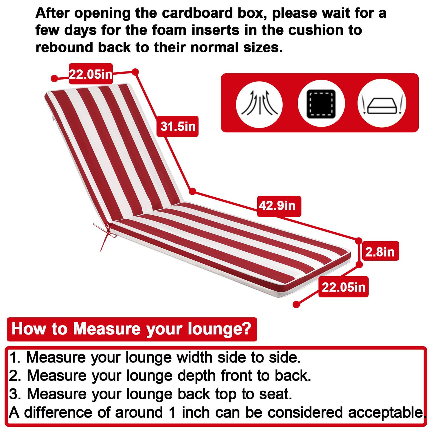 2 Pieces Set Outdoor Lounge Chair Cushion Replacement Patio Furniture Seat Cushion Chaise Lounge Cushion - Red / White