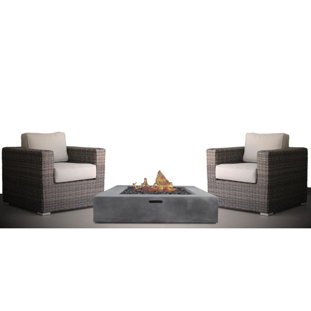 - Complete 3-Piece Set: Includes 2 deep seating wicker armchairs, 1 propane fire pit, 4 cushions, and a fire pit cover.