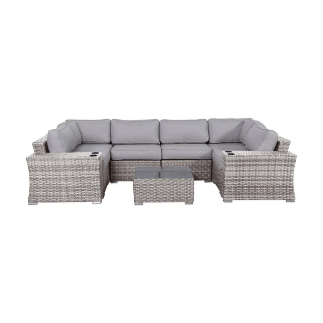 - Complete 9-Piece Set: Includes 1 sofa, 1 sectional, 2 armless chairs, 3 tables, and 14 cushions.