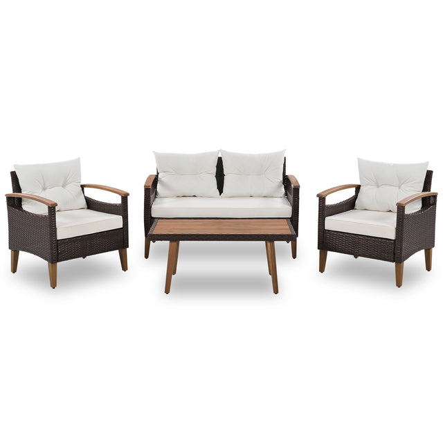 4 Piece Garden Furniture, Patio Seating Set, Outdoor Sofa Set, Wood Table And Legs - Brown / Beige