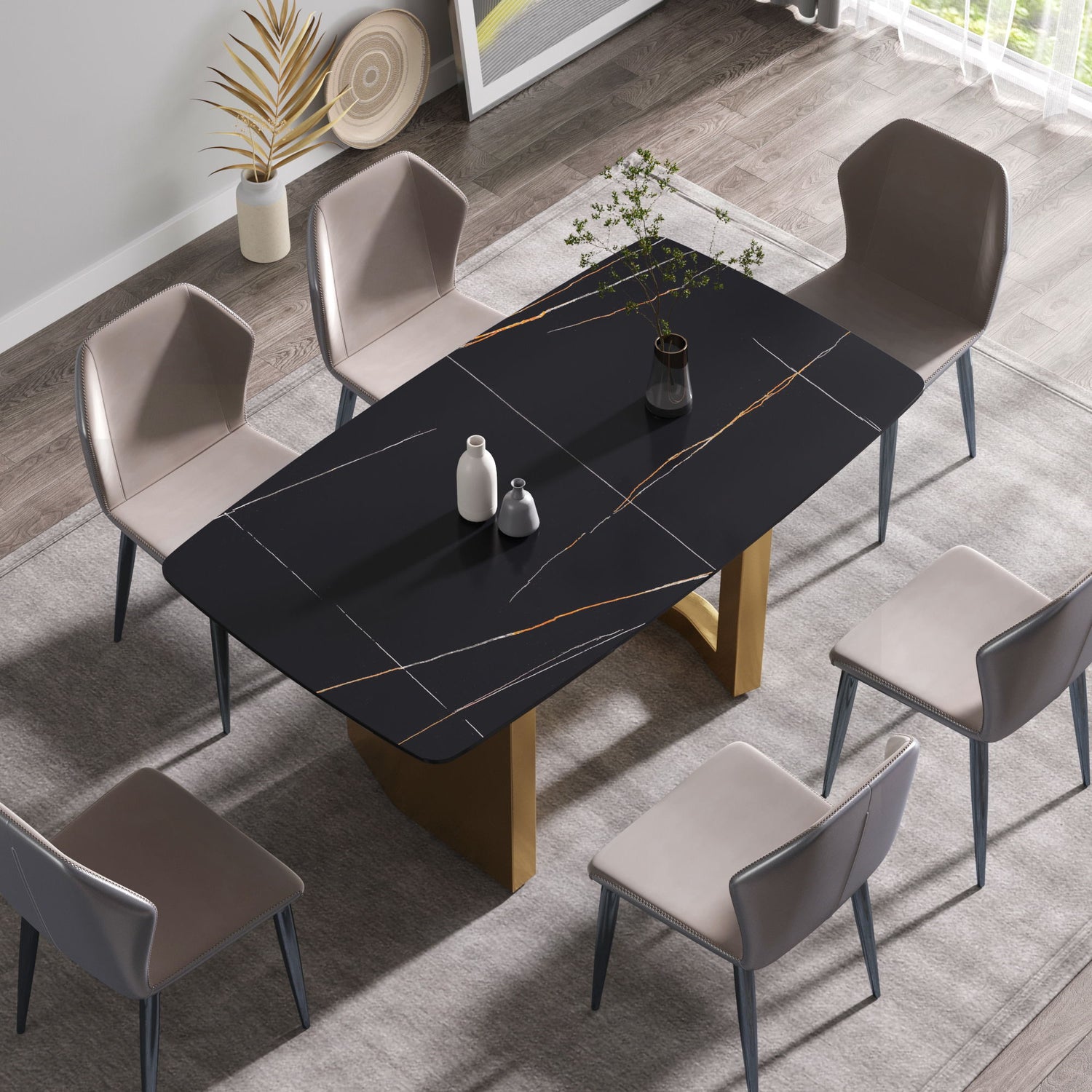 63" Artificial Stone Curved Golden Metal Leg Dining Table, 6 People - Black / Gold