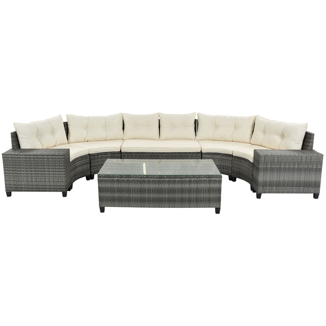 8 Pieces Outdoor Wicker Round Sofa Set, Half-Moon Sectional Sets All Weather, Curved Sofa Set With Rectangular Coffee Table, PE Rattan Water-Resistant And UV Protected, Movable Cushion - Beige