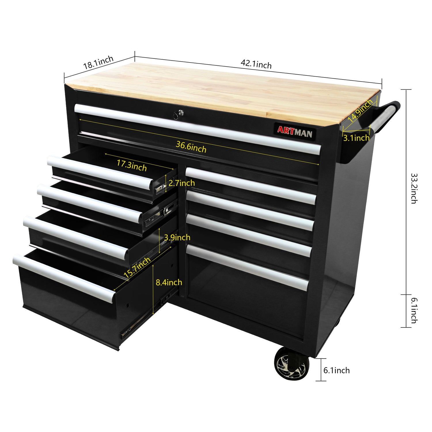 - 9 Drawer Storage: The ARTMAN tool trolley features a total of 9 drawers, providing ample storage space for organizing a wide range of tools, ensuring easy access and efficient workspace organization.