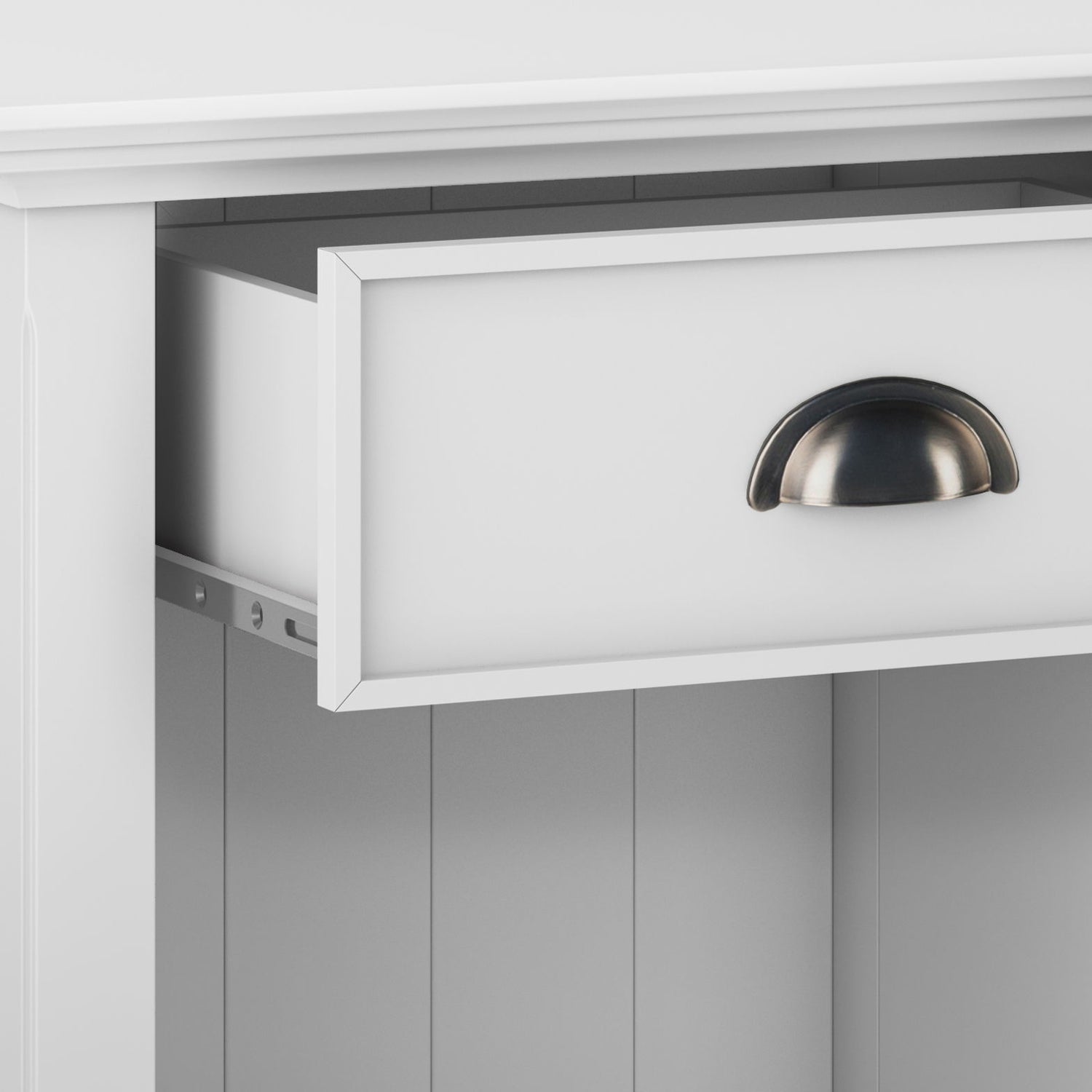 - Features one (1) spacious drawer with metal drawer glides and open bottom storage area