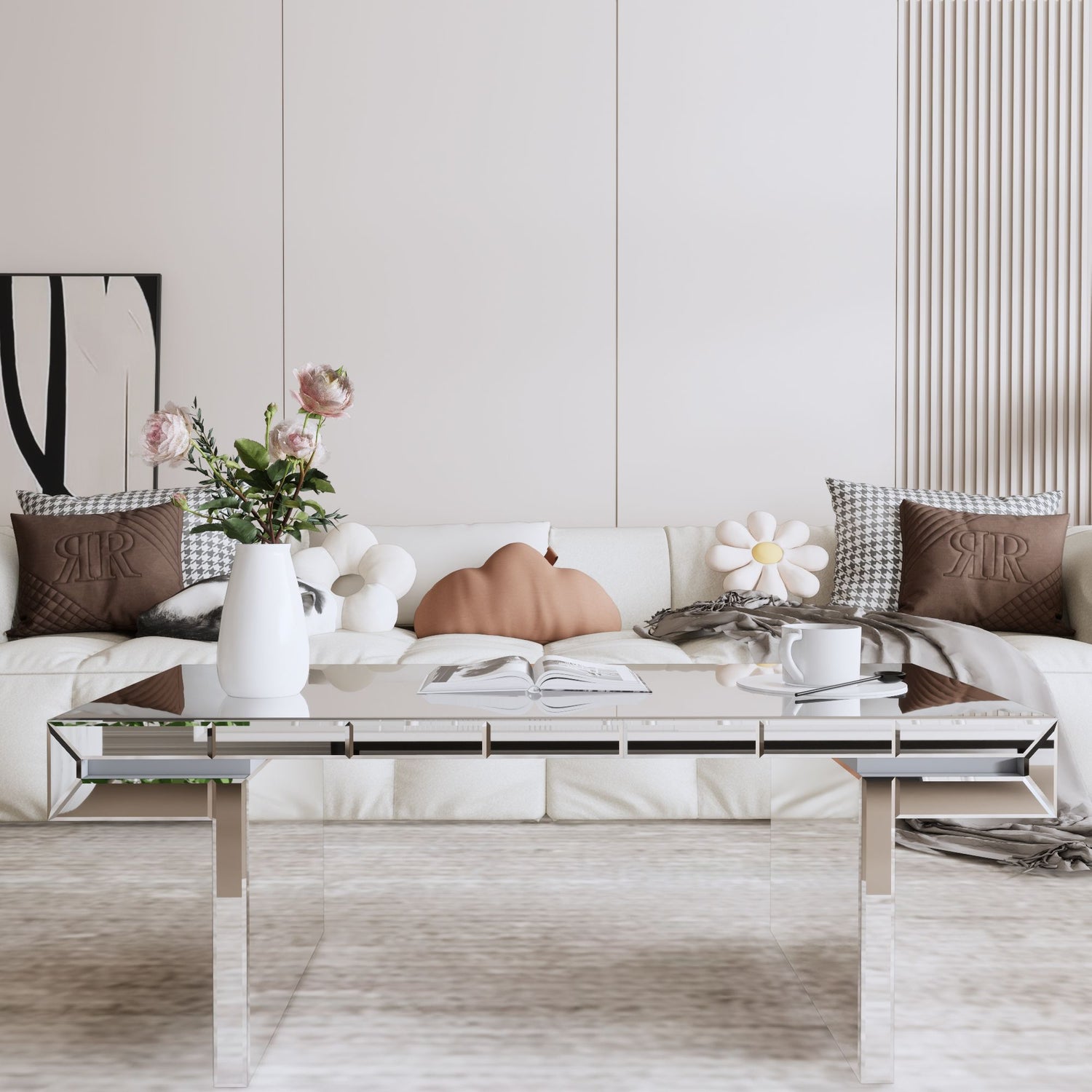 Luxury Rectangular Mirror Coffee Table With Fluted Tempered Glass, Light Luxury Style - Silver