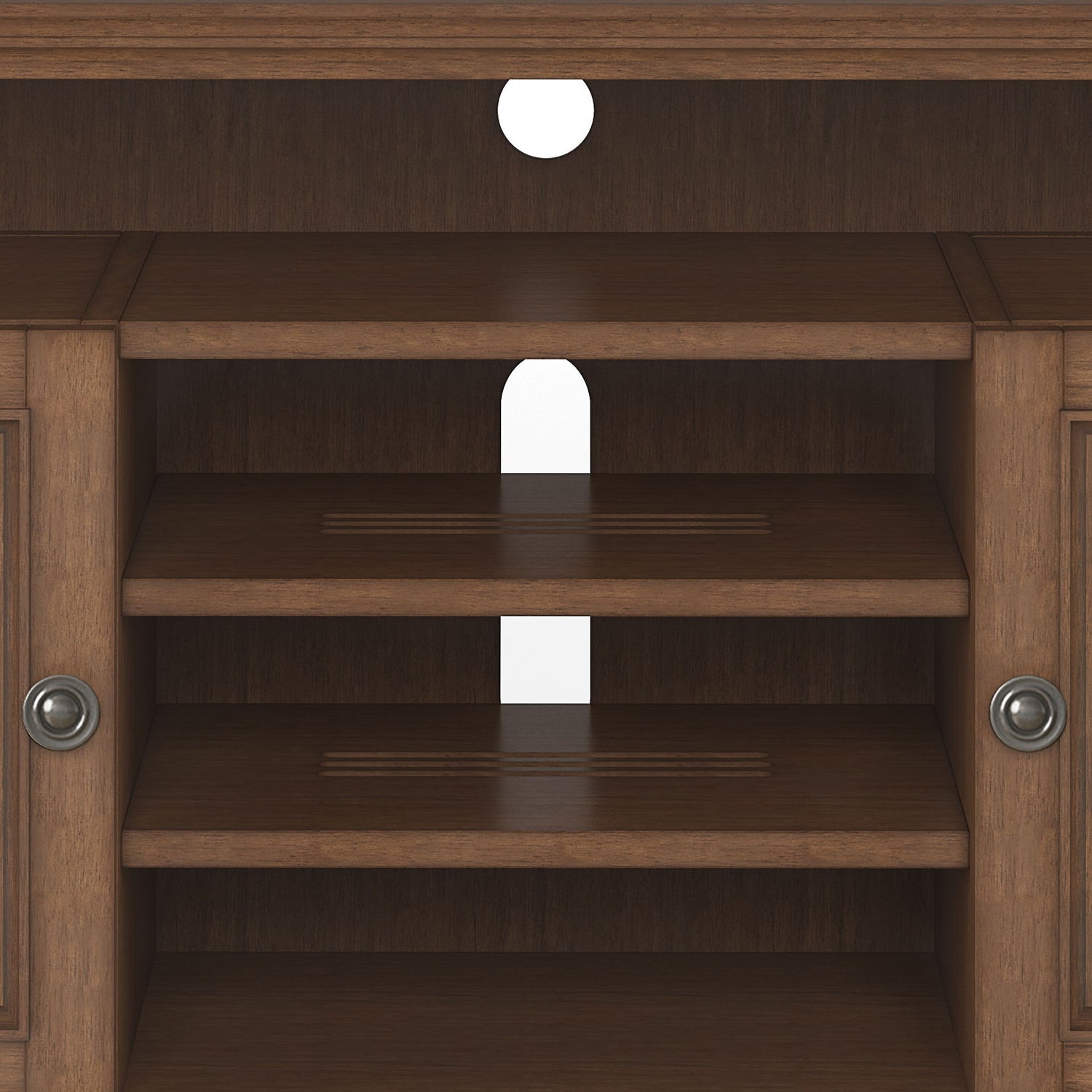 - Features two (2) side doors open to storage areas with two adjustable shelves and a central area with two (2) adjustable shelves and a top open shelf for your media devices.