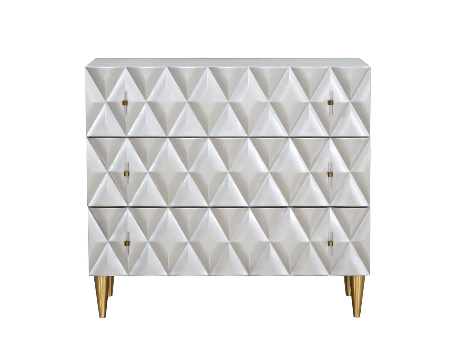 - 3D Diamond-Patterned Facade: The drawers boast a luxurious three-dimensional diamond pattern, paired with gold-tone hardware, offering a chic contrast against the silver finish.