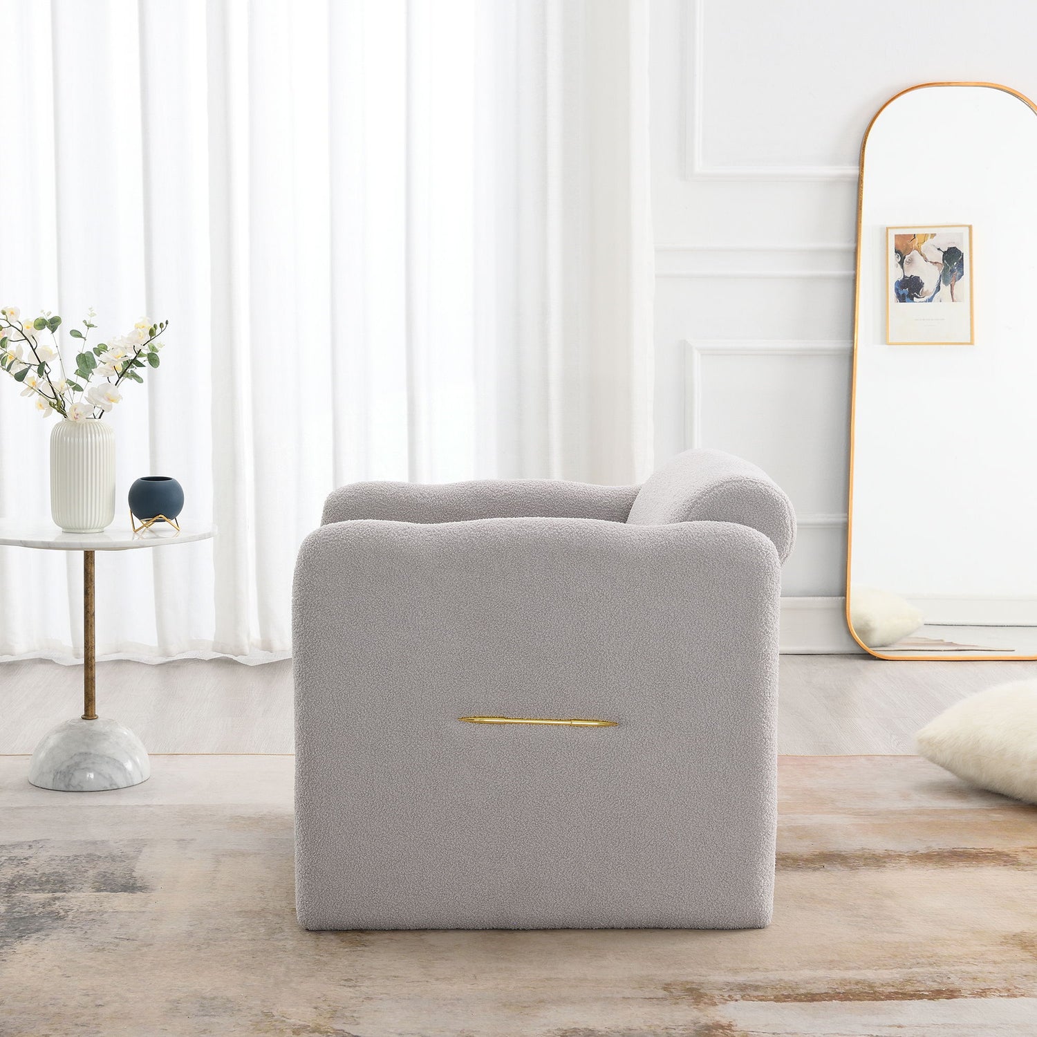 Arm Chair With Waved Arms, Metal Decoration On Both Side Arms, Accent Chair For Primary Living Space, Living Room, Bedroom, Teddy Fabric - Light Gray
