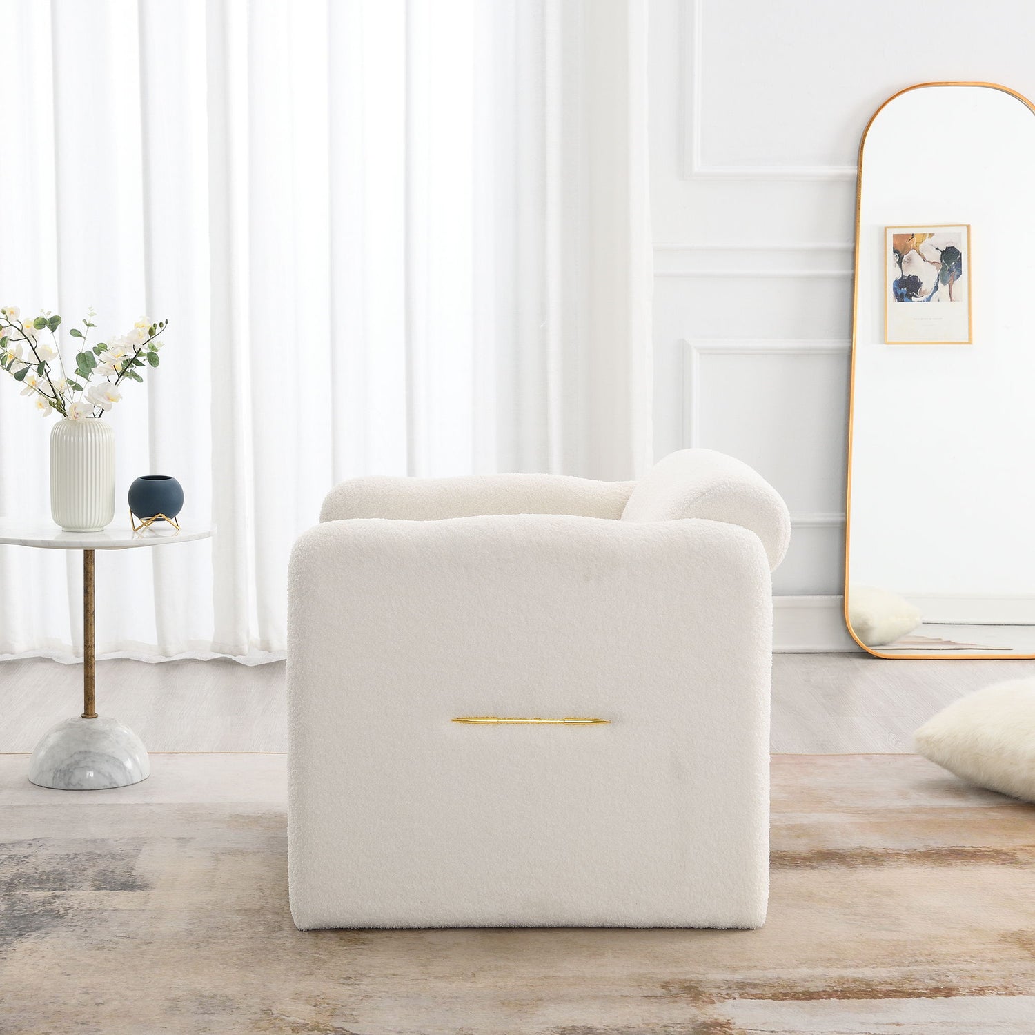 Arm Chair With Waved Arms, Metal Decoration On Both Side Arms, Accent Chair For Primary Living Space, Living Room, Bedroom, Teddy Fabric - White
