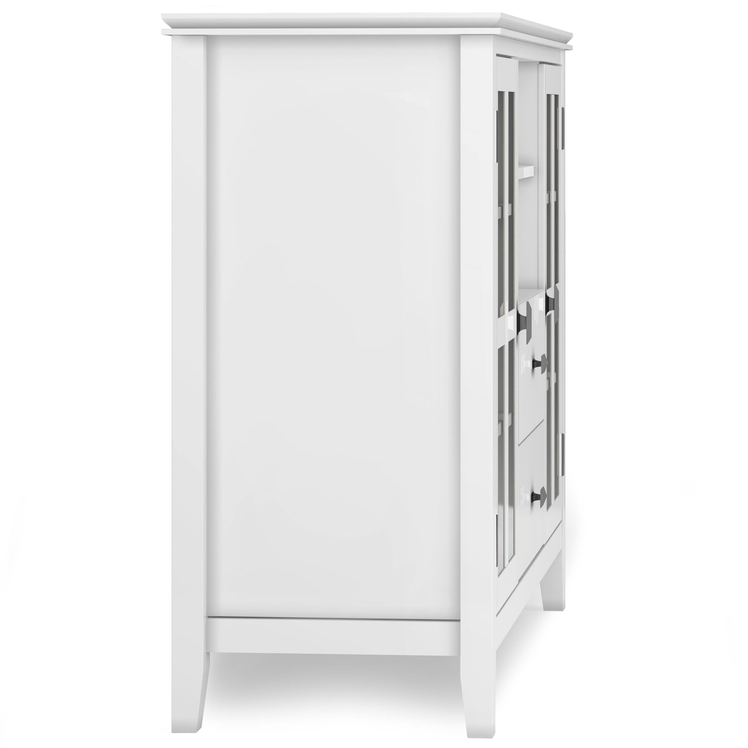 - Features two (2) central drawers with metal glides, open center area with adjustable shelf and two (2) side tempered glass framed doors that open to large storage spaces with two (2) shelves each