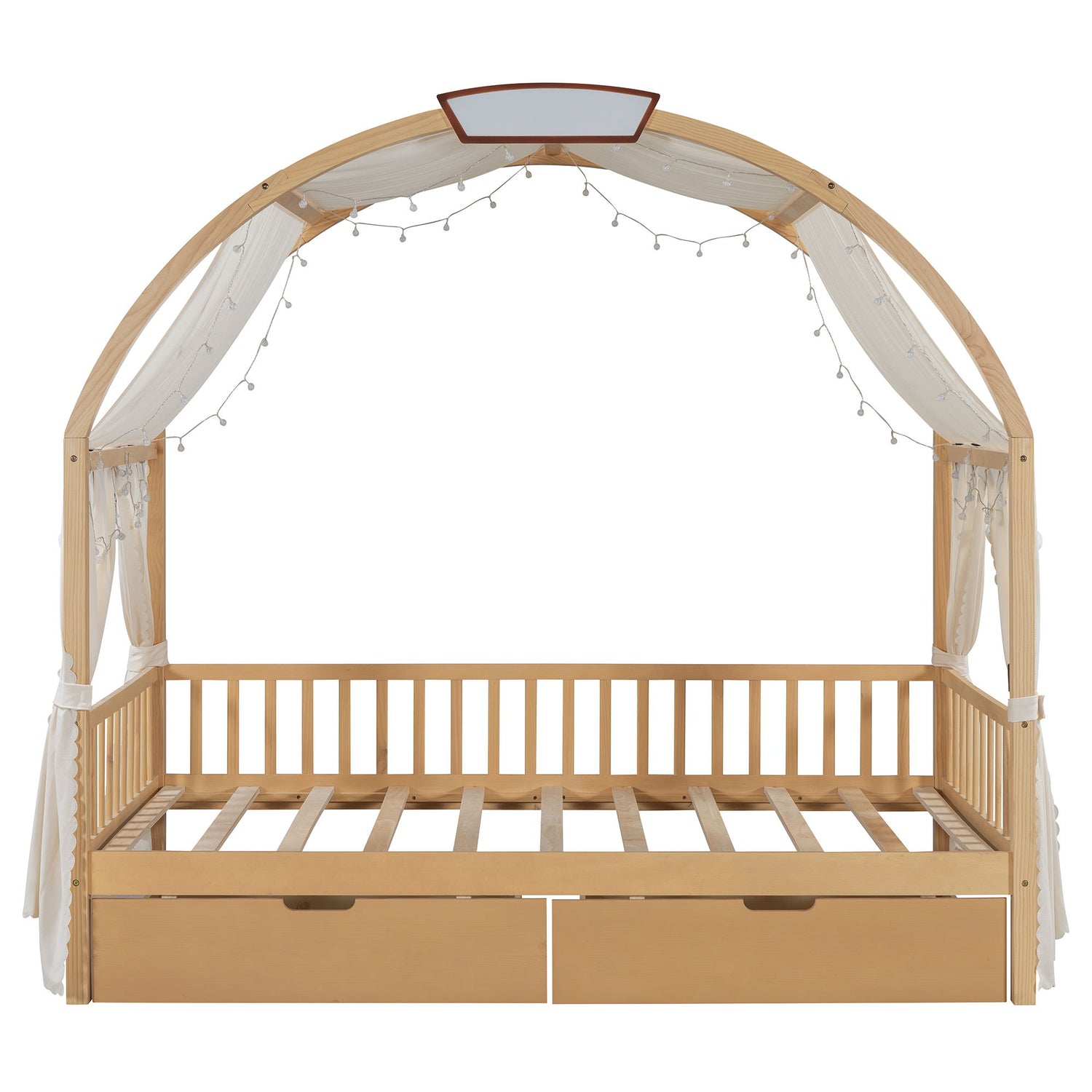 Twin Size Bed With Arched Roof And 2 Drawers - Natural