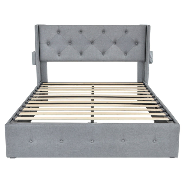 Queen Size Bed Frame With Lift Up Storage, Wingback Headboard And USB Ports - Light Gray