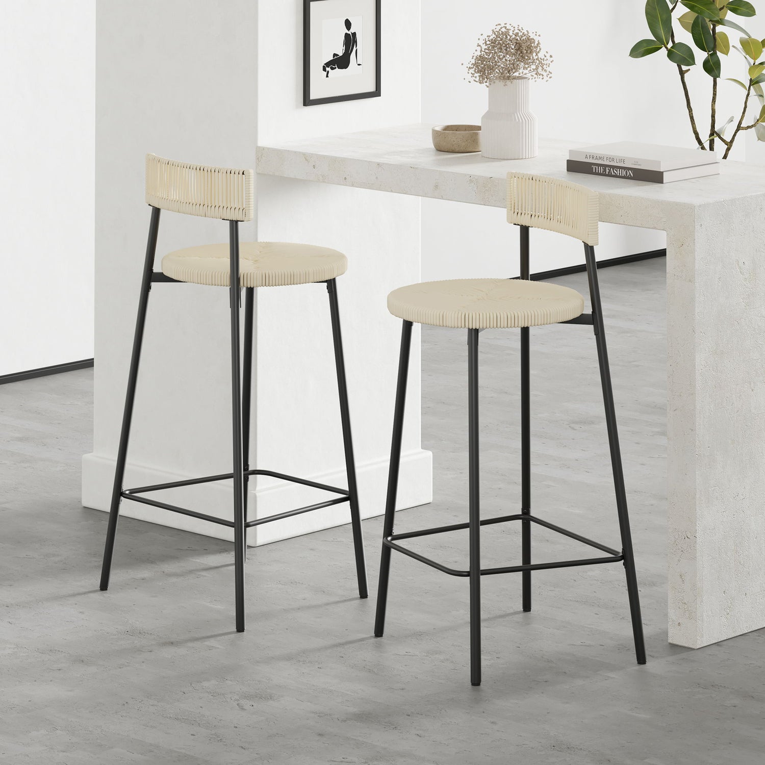 Boho Style Handwoven Paper Rope Counter Stools (Set of 2) - Creamy White