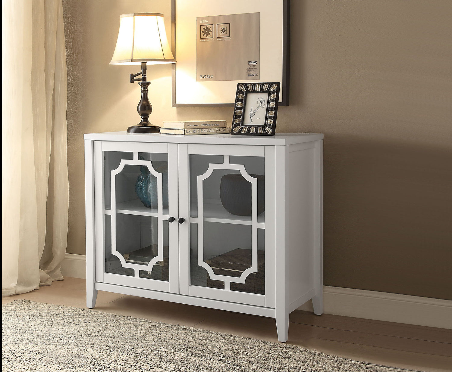 - Design and Structure: The Ceara White Finish Console Cabinet features a sleek rectangular design with two glass doors, providing an elegant aesthetic. It is supported by wooden tapered legs, offering a modern touch to any room.
