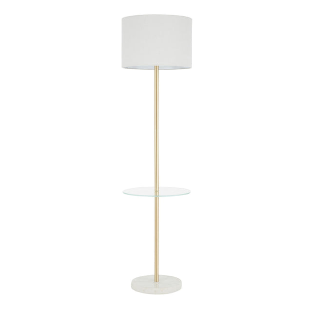 - Sleek and Functional Design: The Chloe Shelf Floor Lamp by LumiSource features a modern design with a gold neck, round glass shelf, marble base, and white linen shade, perfect for adding a stylish touch to any space.