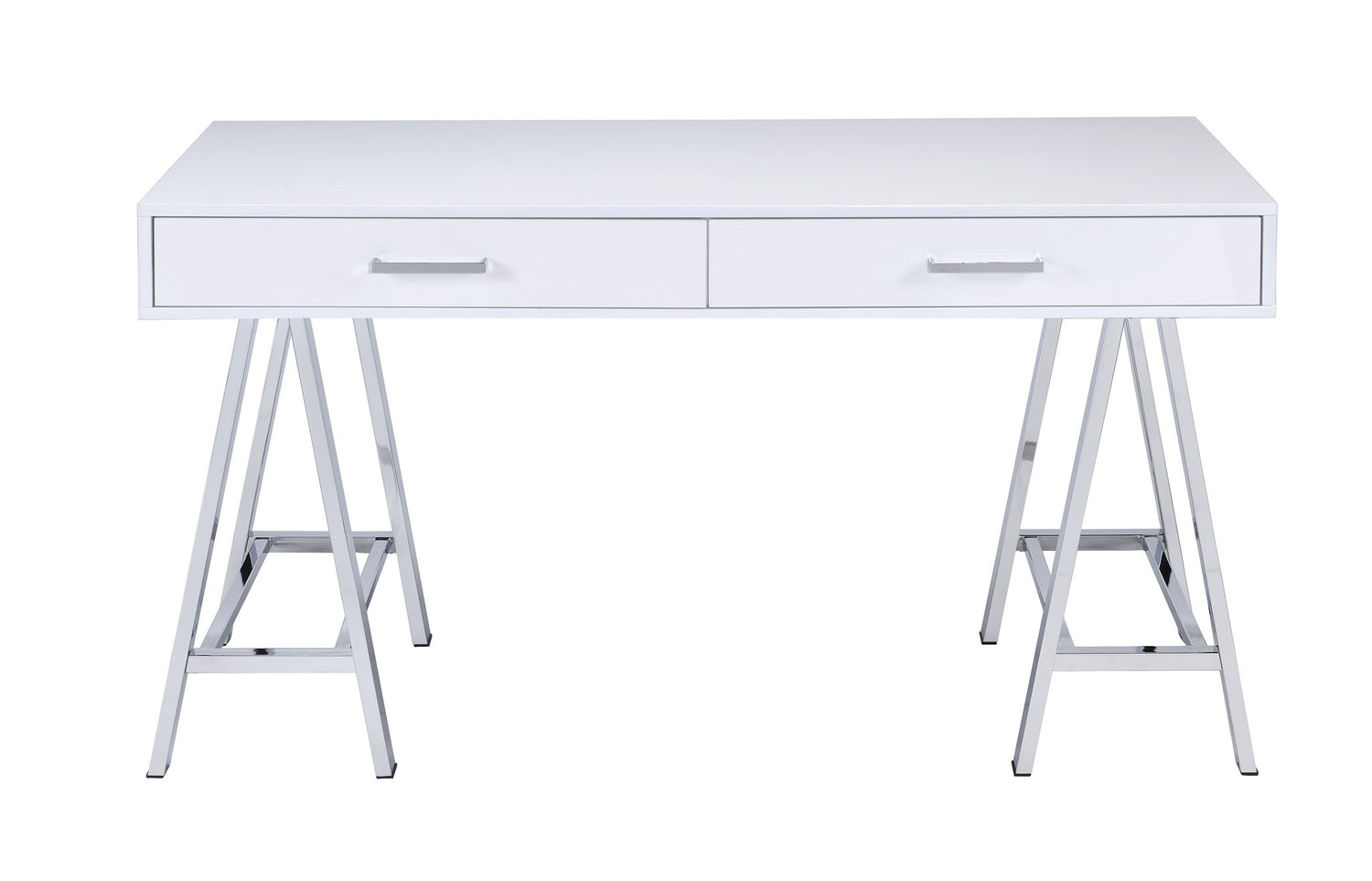 - Design and Finish: The Coleen Writing Desk features a sleek, high gloss finish paired with a chrome metal base, offering a modern and stylish look suitable for any workspace.