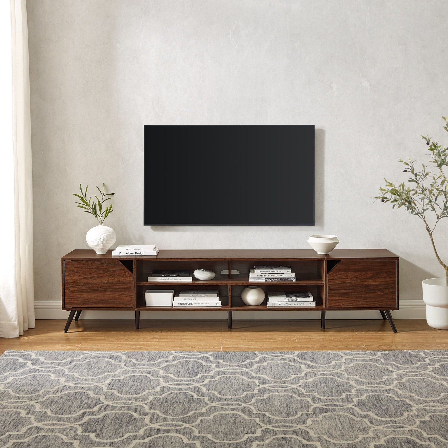 Contemporary 2 Door Minimalist TV Stand For TVs Up To 90" - Dark Walnut is backordered and will ship as soon as it is back in stock.