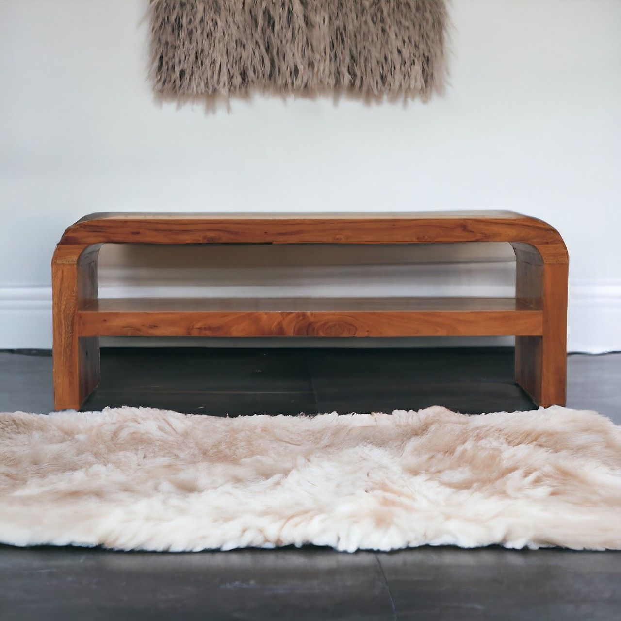 - Artisan Furniture Solid Wood Darcy Media Unit with Shelf - Add this Darcy Media Unit to your interior, it has smooth round edges, making it child and pet friendly in the home. It is constructed from 100% solid acacia wood in an caramel finish and features a large open drawer that can be used to store game consoles, tv boxes and more.