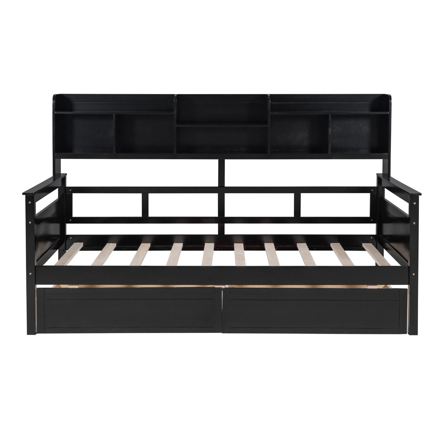 Twin Size Daybed, Slat Support, With Bedside Shelves And 2 Drawers - Espresso