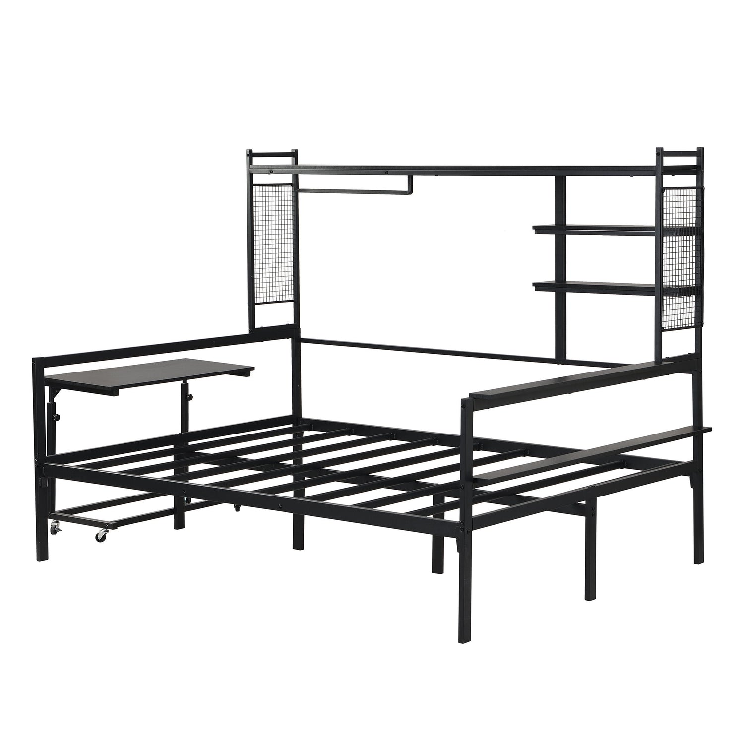 Full Size Daybed With Movable Desk, Grid, Shelves And Clothes Hanger - Black