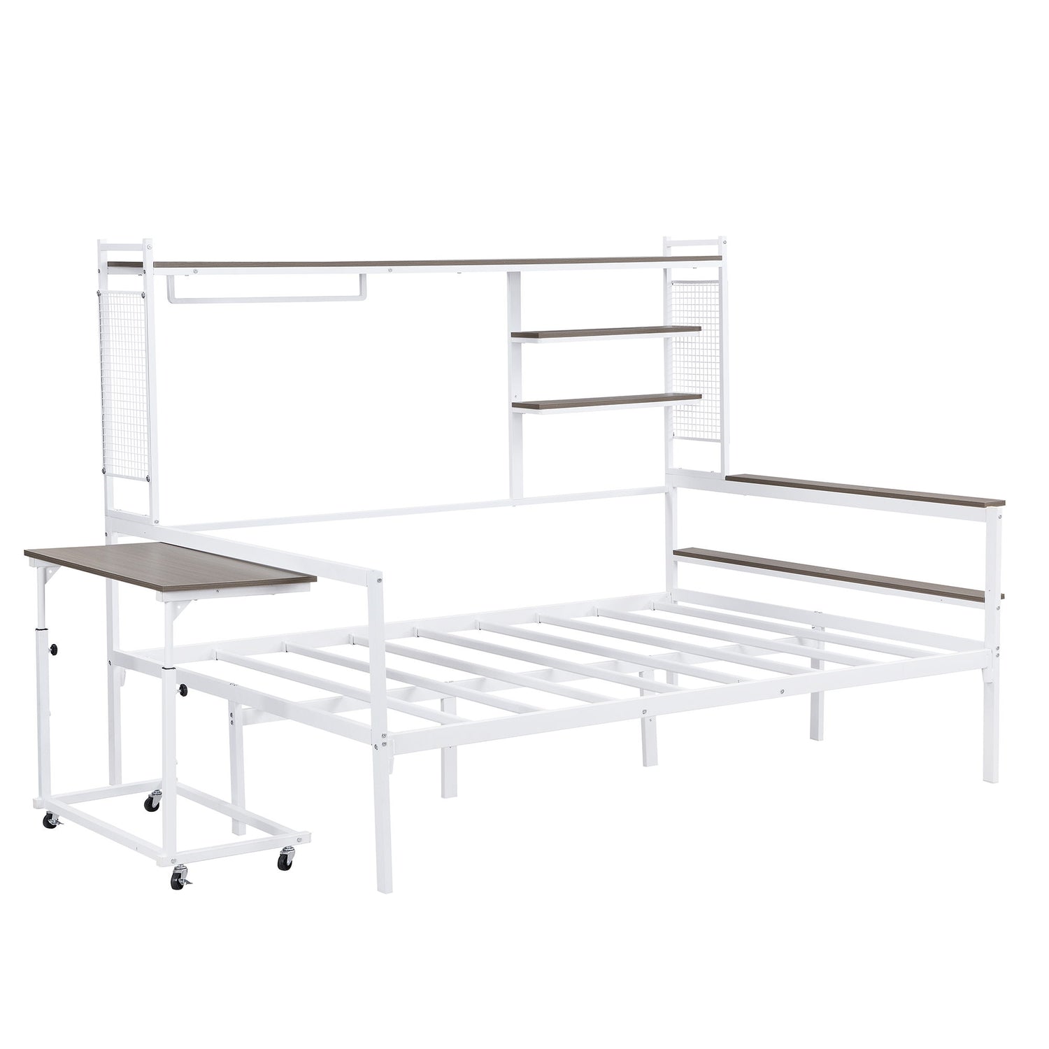 Twin Size Daybed With Movable Desk, Grid, Shelves And Clothes Hanger - White