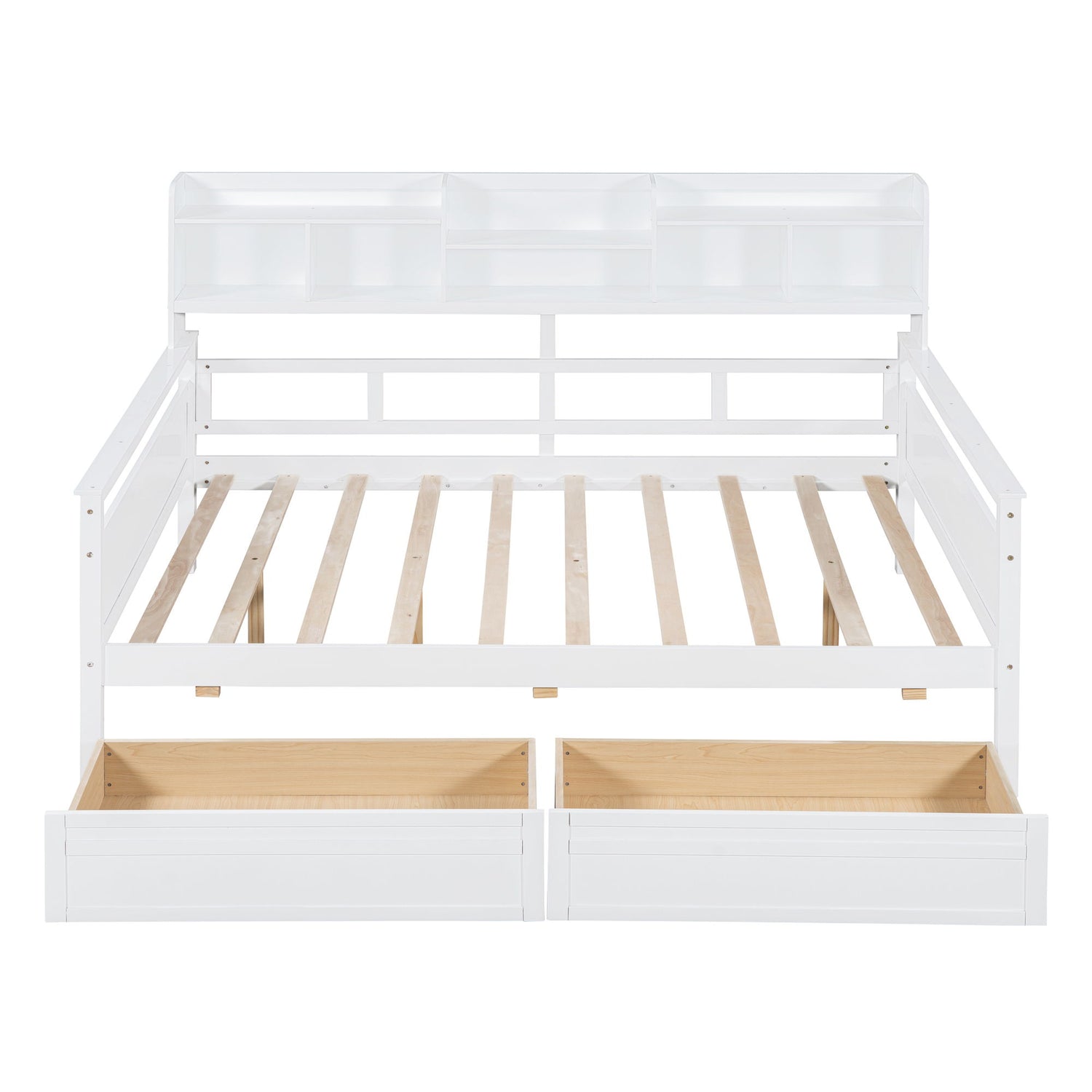 Full Size Daybed, Slat Support, With Bedside Shelf And Two Drawers - White