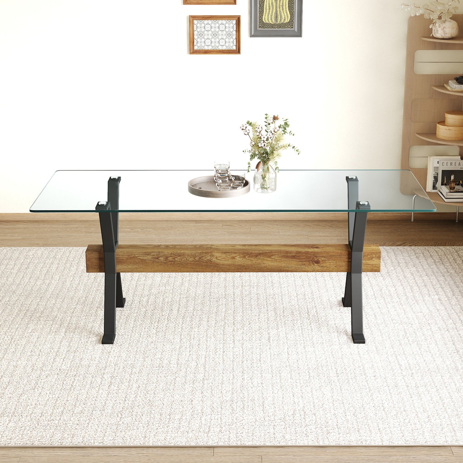 Elegant Tempered Glass Dining Table With X Shaped Metal Legs And Wood Grain Crossbeam - Black / Transparent