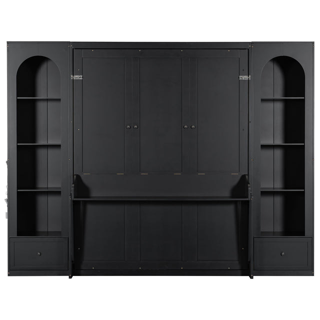 Queen Size Murphy Platform Bed With Shelf, Side Cabinets, Drawers And LED - Black