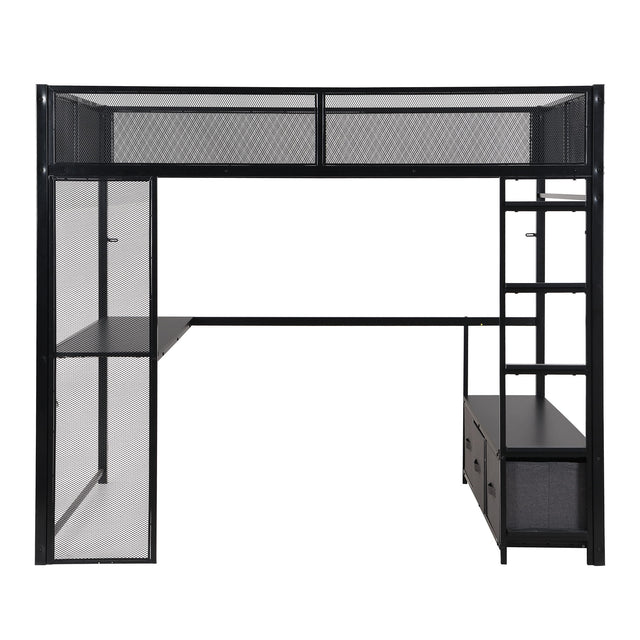 Full Size Gaming Loft Bed With LED Desk, Open Wardrobe, 3 Linen Storage Drawers - Black