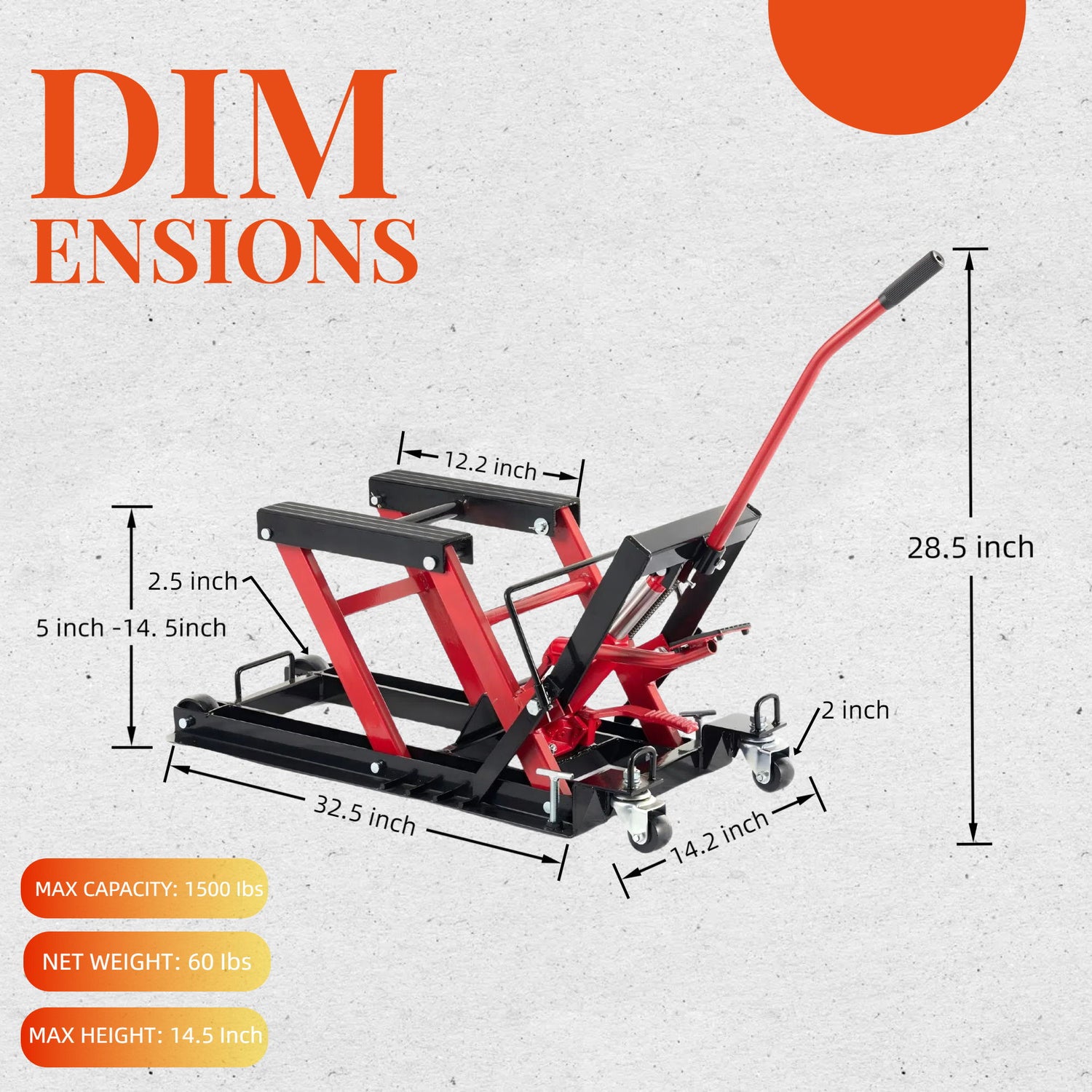 - Hydraulic Lifting Capacity: Safely lifts motorcycles/ATVs up to 1500 lbs to an optimal working height.