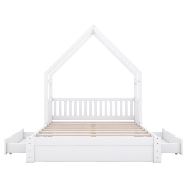 House Style Queen Size Platform Bed With Guardrail And 2 Drawers - White