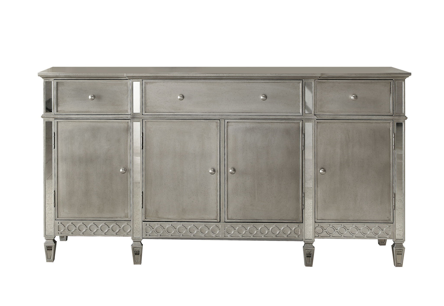 - Elegant Design: This server boasts a mirrored and champagne finish, exuding sophistication and elegance in any dining or living space. Its rectangular design with a wooden top and geometric apron-base trim provides a timeless look.