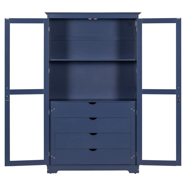 Kitchen Pantry, Freestanding Kitchen Storage Cabinet Display Cabinet With Glass Doors And 4 Built In Drawers For Living Room, Home Office - Blue