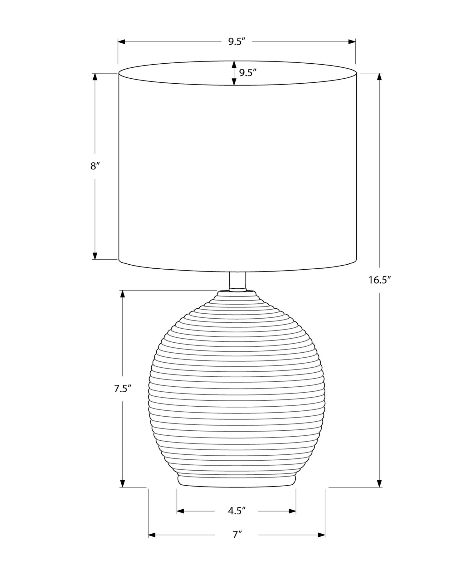- Product Dimensions: Overall dimensions are 9.5" L x 9.5" W x 16" H with a base of 7" L x 7" W x 7.5" H and a shade of 9.5" L x 9.5" W x 8" H.