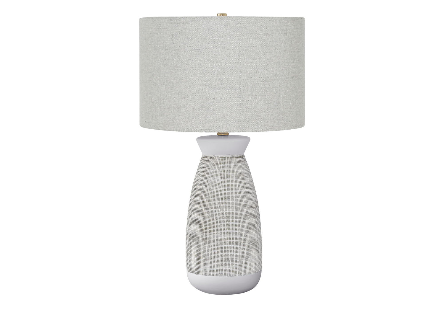 - Stylish Design: This 27-inch ceramic table lamp features a smooth white and textured grey vase-shaped base, topped with a beige linen drum shade and a silver finial, adding a fresh and fashionable touch to any contemporary space.