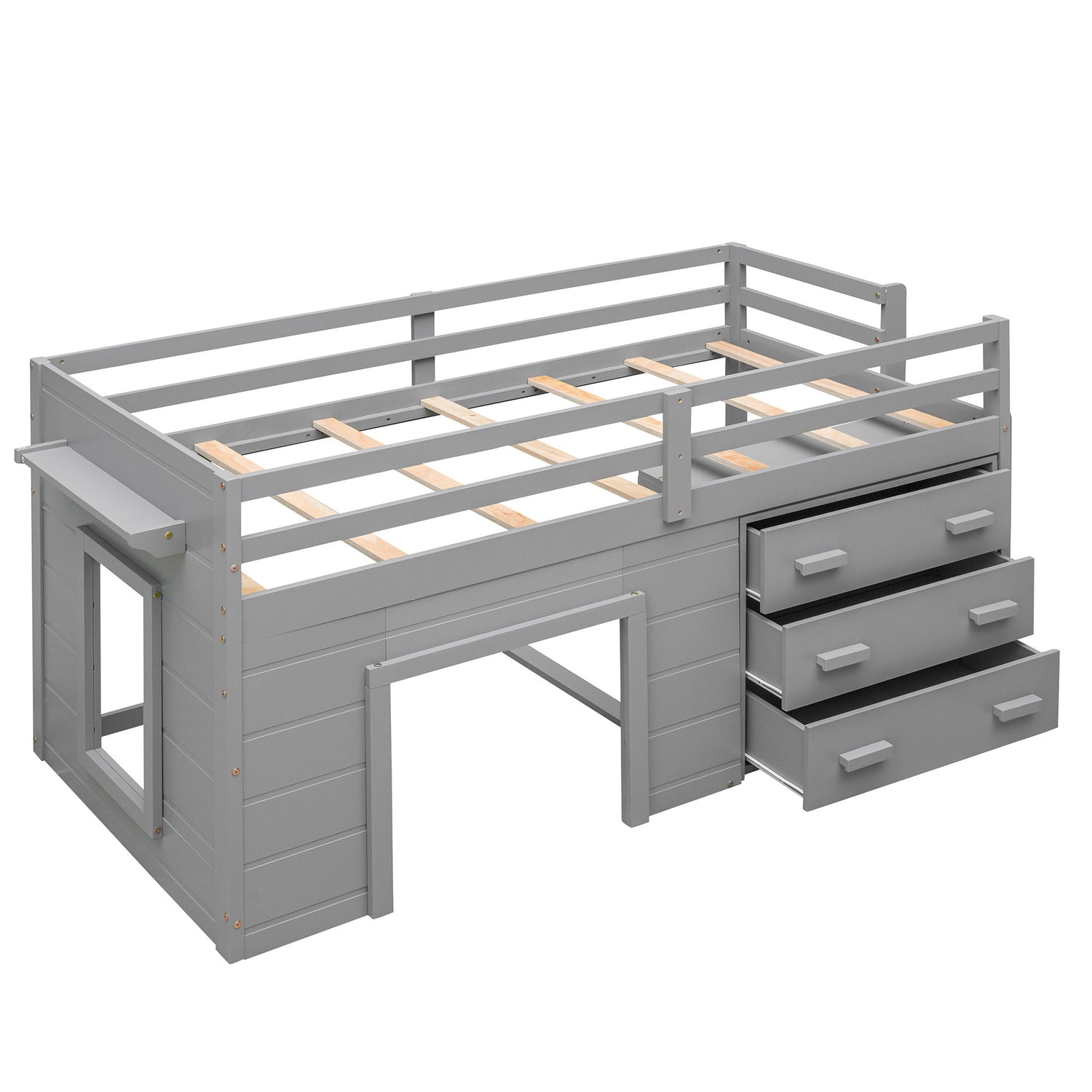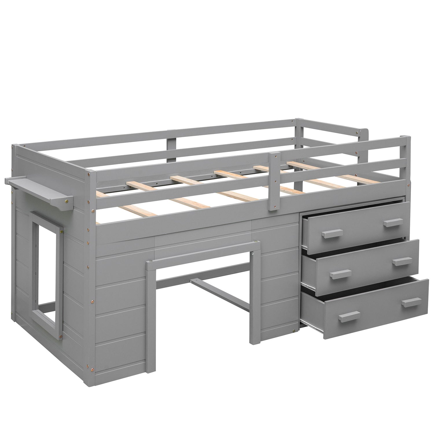 Twin Size Loft Bed With Cabinet And Shelf - Gray