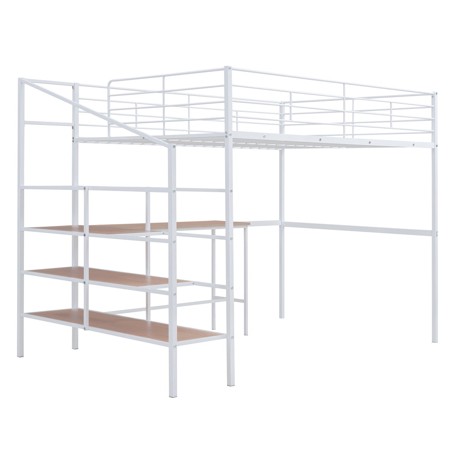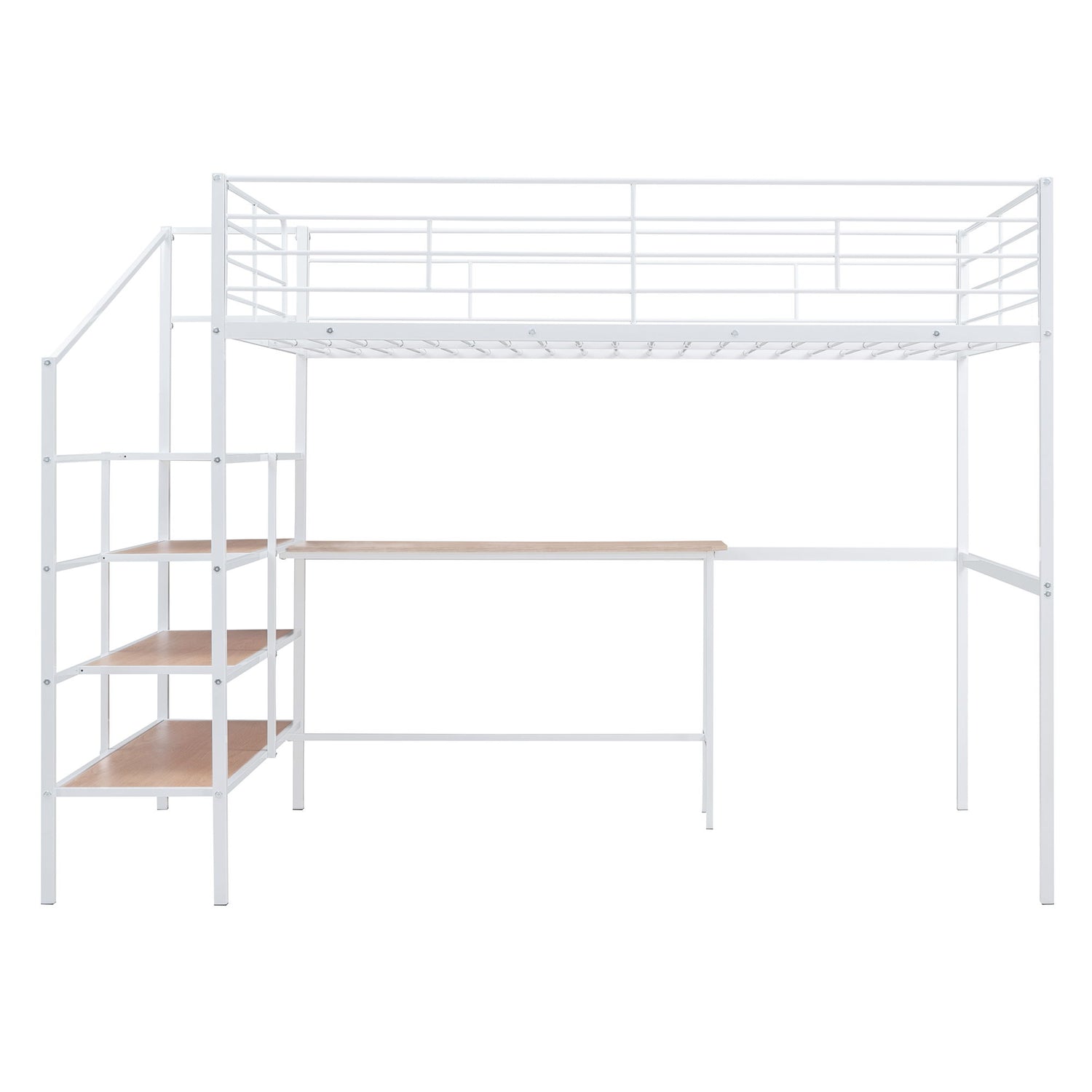Crafted of metal in a clean painted finish, this metal loft bed strikes a clean-lined silhouette with slatted guardrails. The lateral four-layer ladder of the loft bed can be used as shelves to display whatever you want, including a lamp, books, toys, and more. You can place decorations on the top and home items on the bottom. Equipped with a large desk underneath, this bed offers a comfortable space to work, read, and relax. With your creativity, this loft bed can be both beautiful and practical.
