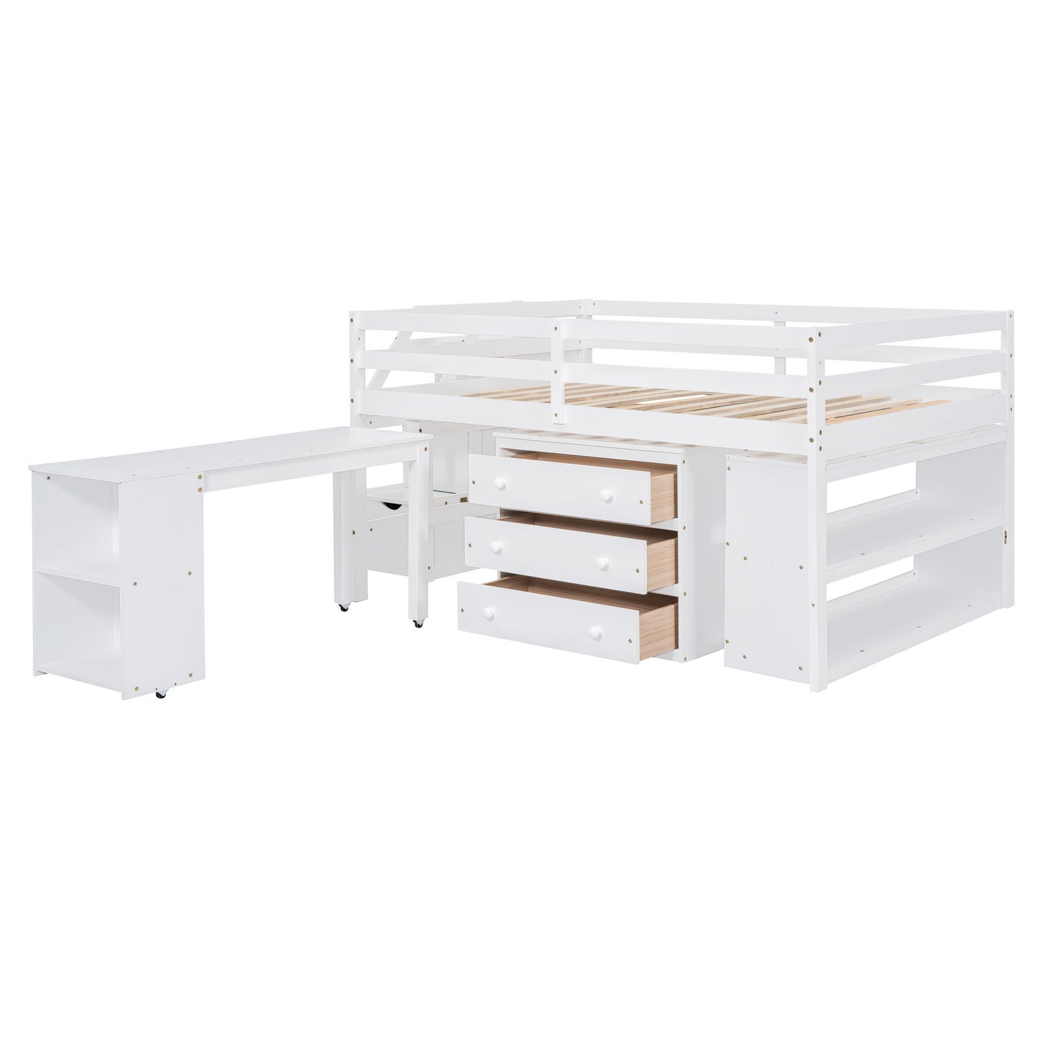 Full Size Loft Bed With Retractable Writing Desk And 3 Drawers With Storage Stairs And Shelves - White