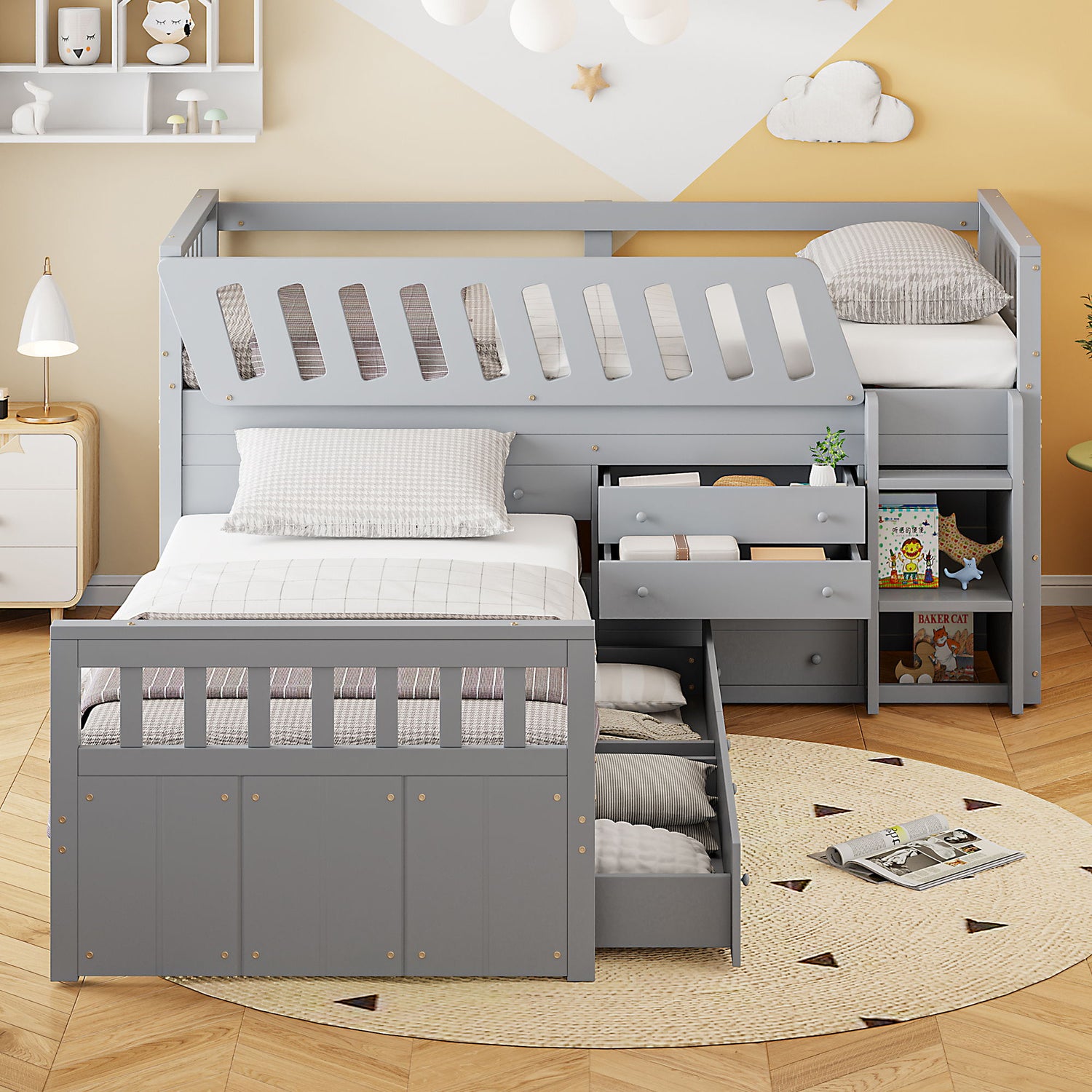 Twin Loft And Platform Bed With 7 Drawers And Full Guardrails, Modern L Shaped Space Saving - Gray