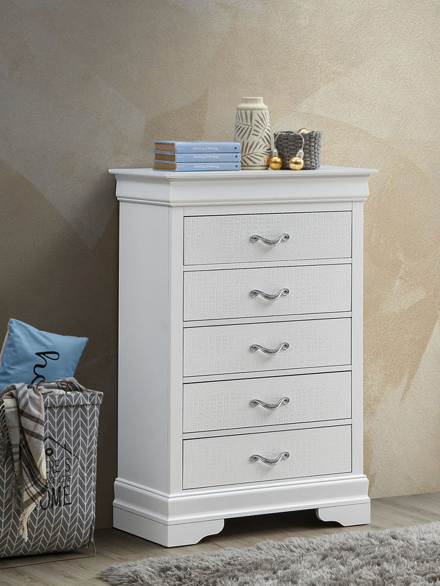 - Embossed Textured Finish: Drawer fronts have a textured finish that adds depth and style to the piece.
