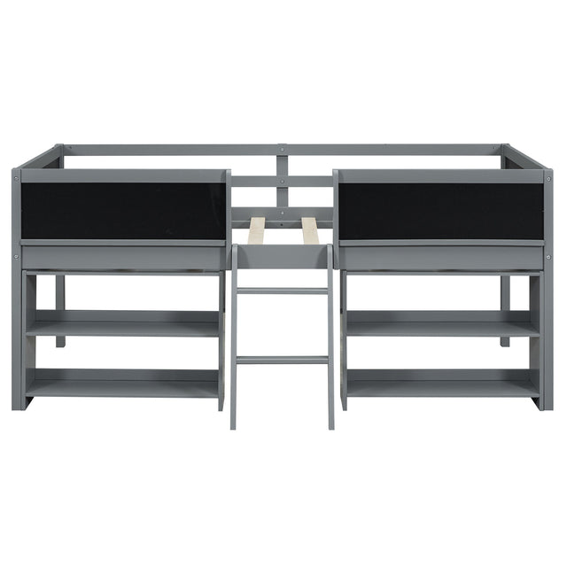 Twin Size Low Loft Bed With Movable Shelves And Ladder, Decorative Chalkboard Guardrail - Gray