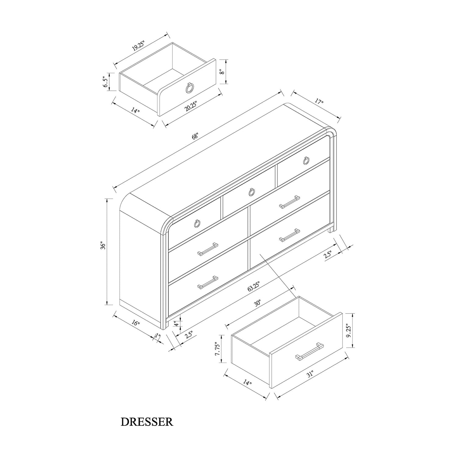 68.0"W x 17.0"D x 36.0"H - 171.6 lb