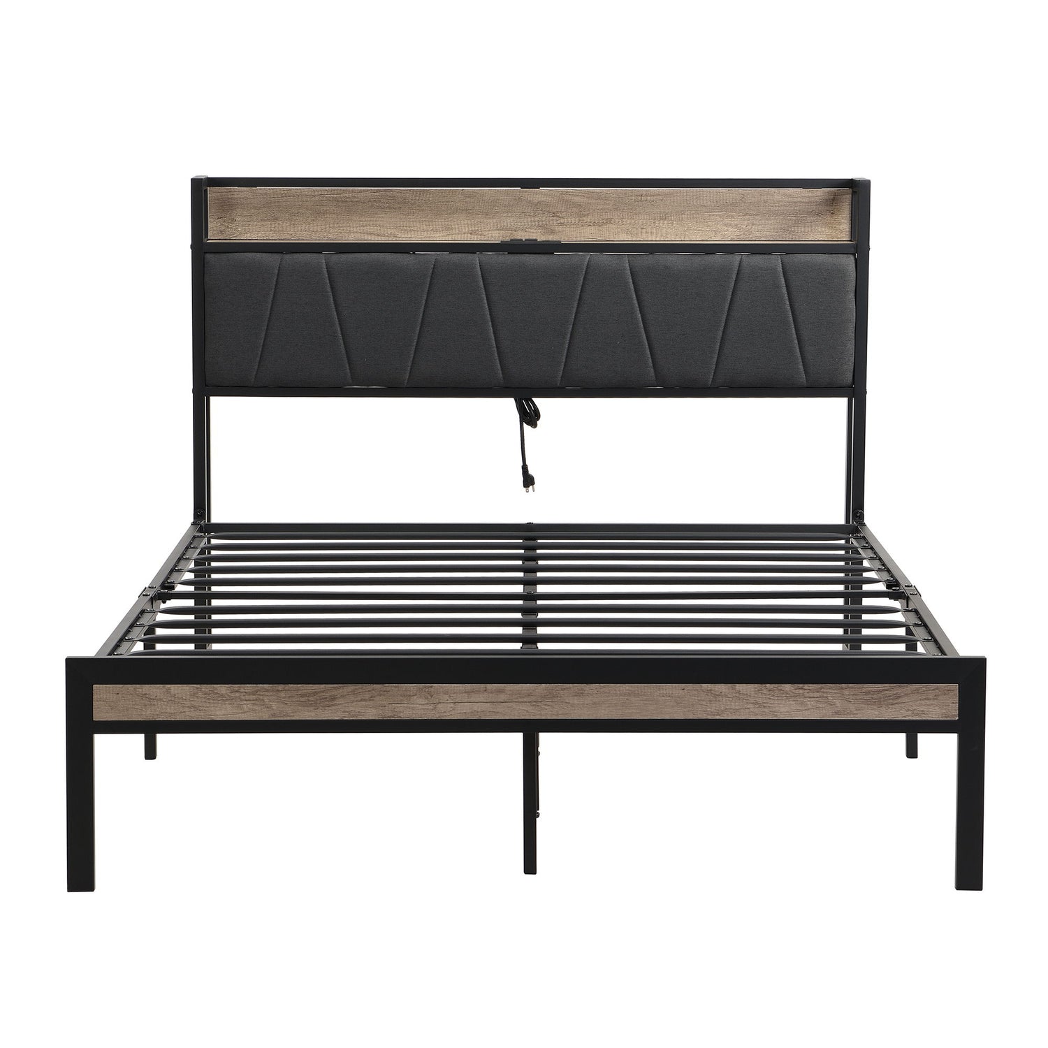 Full Size Modern Metal Platform Bed Frame With Upholstered Headboard, USB Liner, And Storage Drawers - Black / Gray