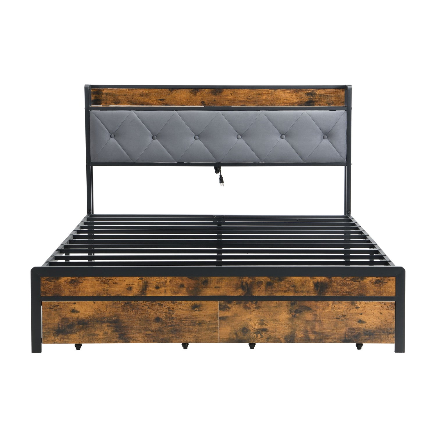 Modern Queen Bed Frame With LED Lights, Storage Drawers, USB & Charging StationUpholstered Headboard, & Iron - Gray