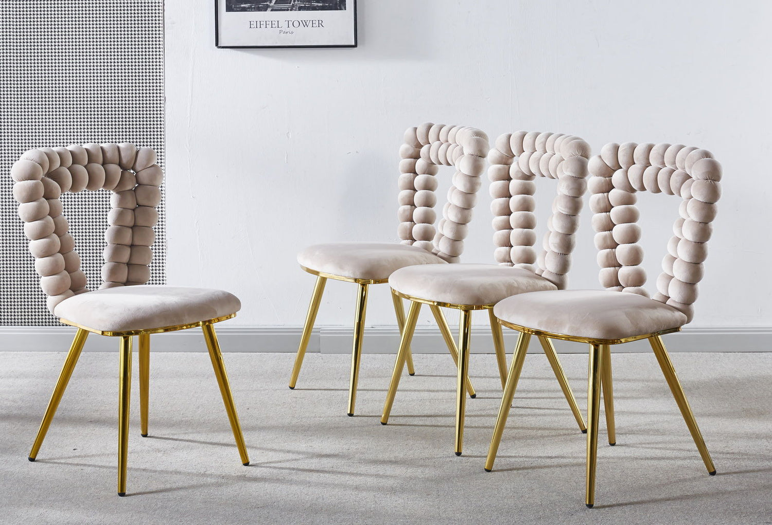 Modern Chair With Iron Tube Legs, Soft Cushions And Comfortable Backrest, Suitable For Dining Room, Living Room, Cafe, Hairball Back (Set of 4) - White / Gold