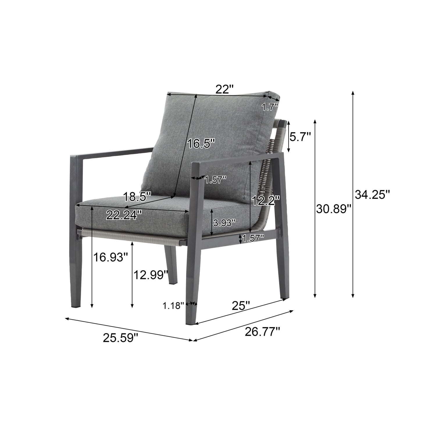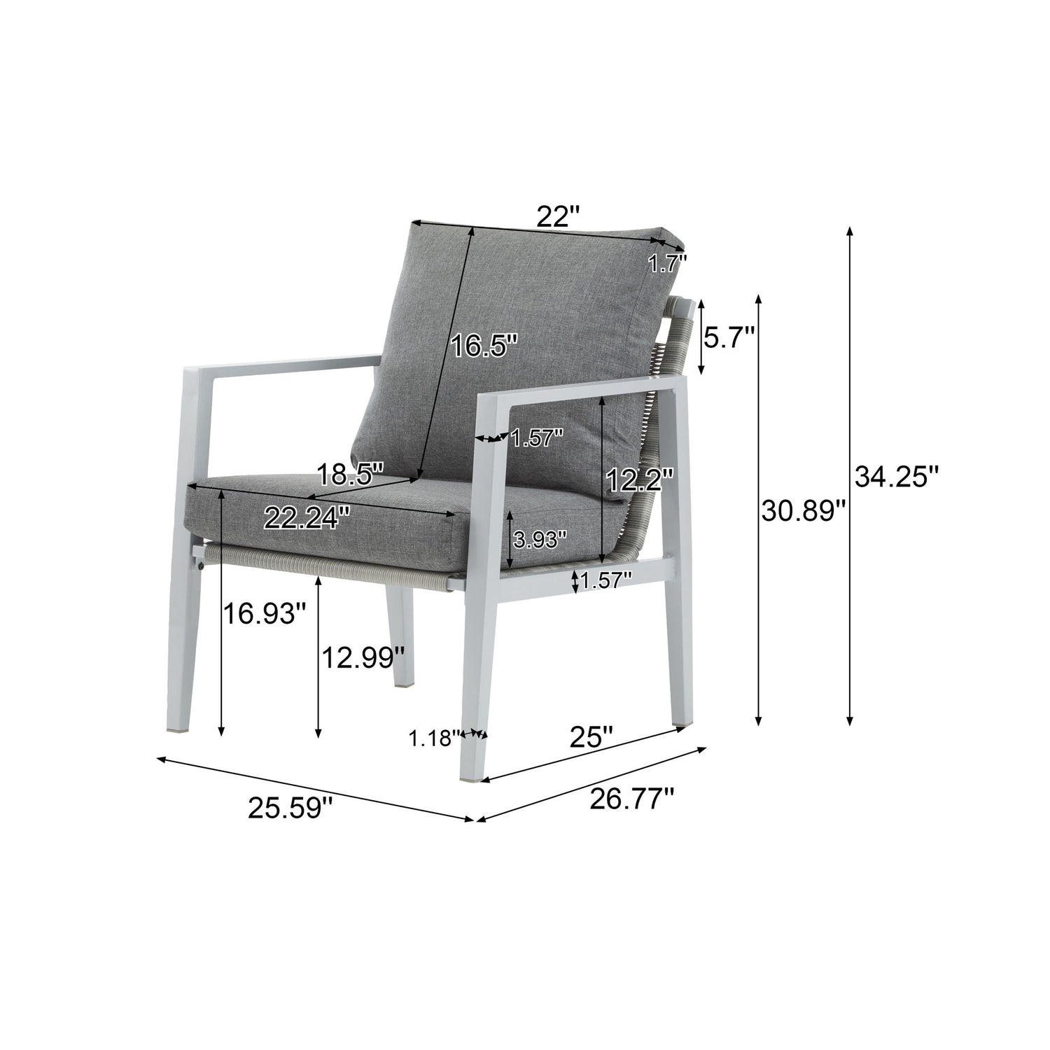 Aluminum Lounge Chair With Sleek Rope Accents, Comfortable Cushions, For Modern Indoor Outdoor Spaces - Gray / Silver / White