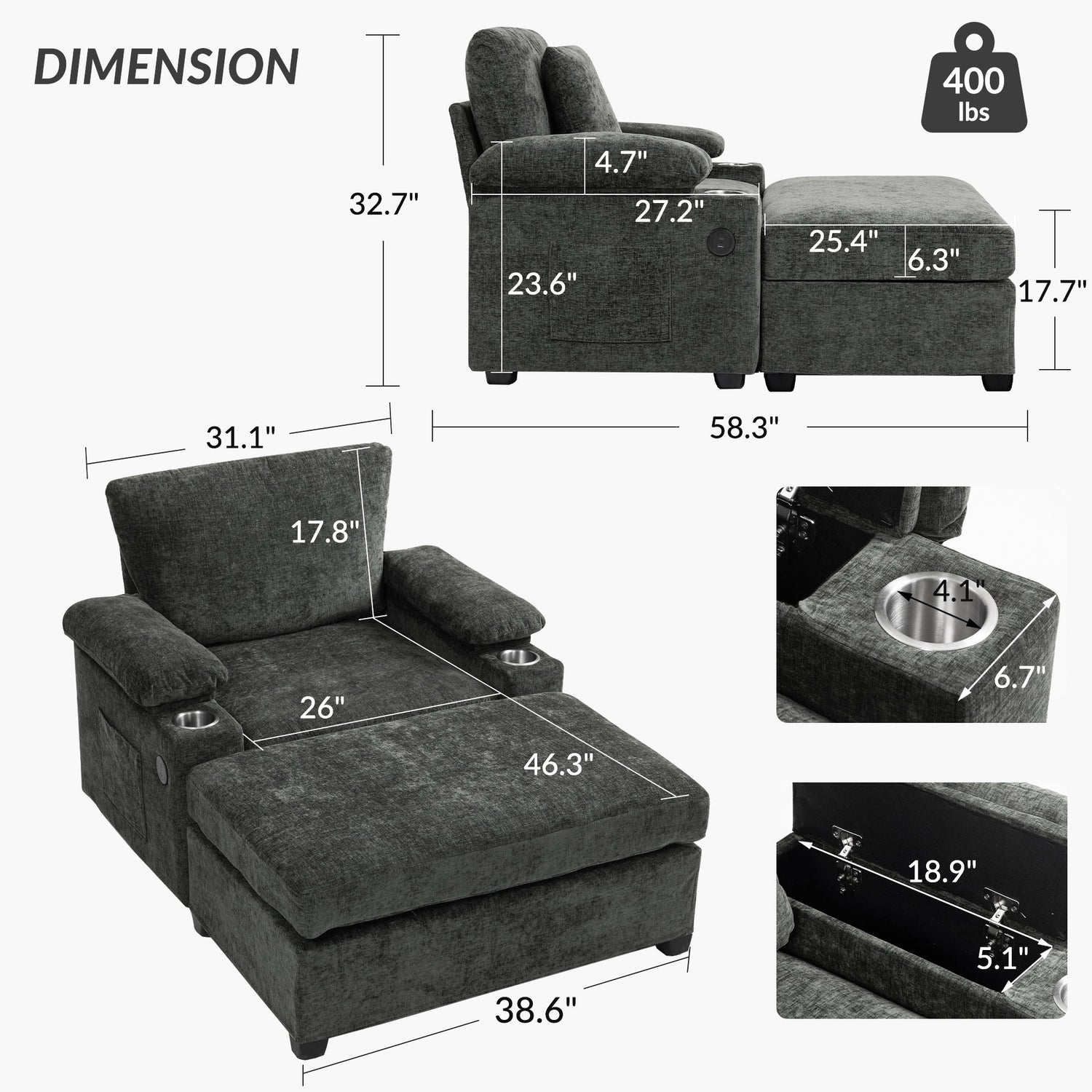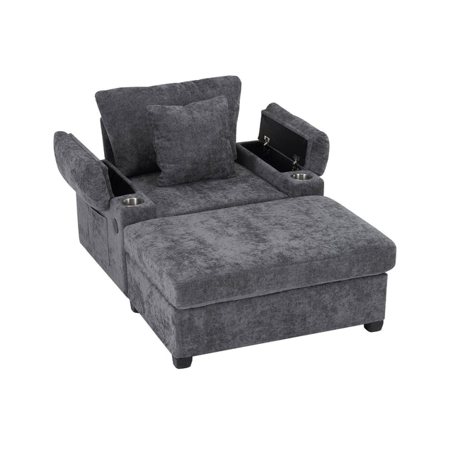 Modern Oversized Chair With Ottoman, Chenille Fabric Sofa Bed, Accent Chair Comfy Sofa With Cupholders And USB Charging Ports Chair For Living Room - Dark Gray