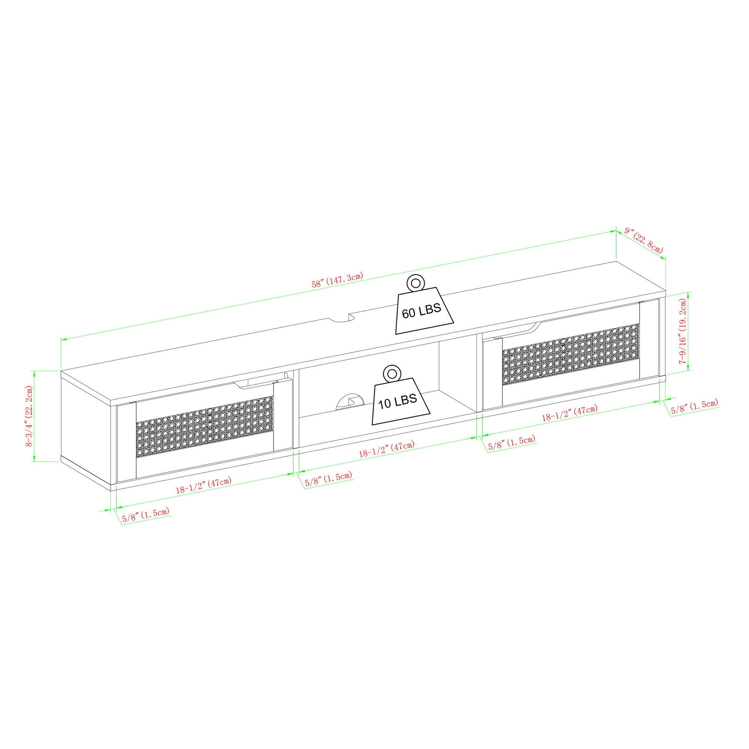 58.0"W x 9.0"D x 8.75"H - 30.0 lb