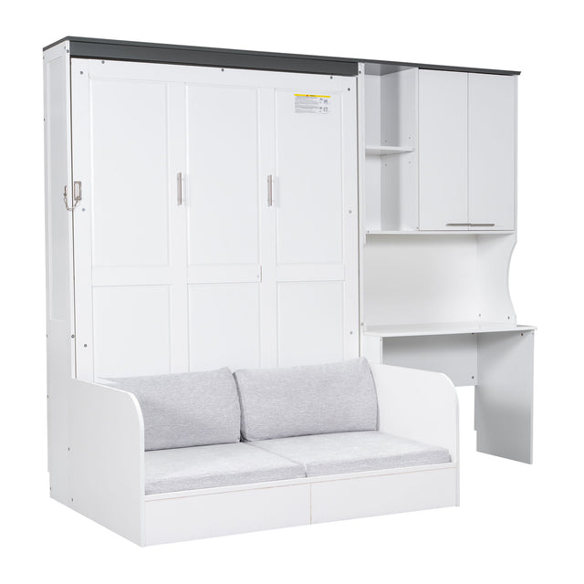 Multi Functional Murphy Bed With Sofa, Desk, And Storage Cabinet In, Full Size - White