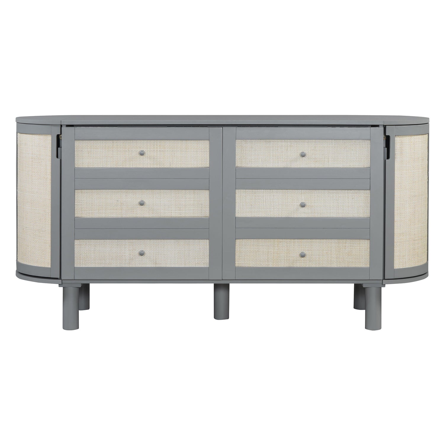 Sleek Drawer-Front Design: Camouflaged drawers with handwoven rattan accents blend rustic-modern charm into any décor. The minimalist yet functional front panels enhance aesthetics while discreetly concealing storage.